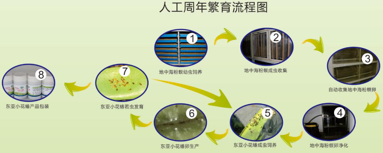 ①东亚小花蝽生产线(包括中间寄主麦蛾生产线400平米和小花蝽繁育生产线80平米)常年保持周产小花蝽500瓶(100虫/瓶),可每周发货2次。